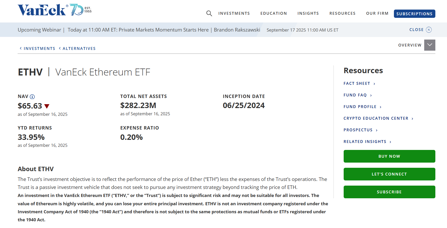 | VanEck Ethereum ETF (ETHV) | $282M | 0.2% |