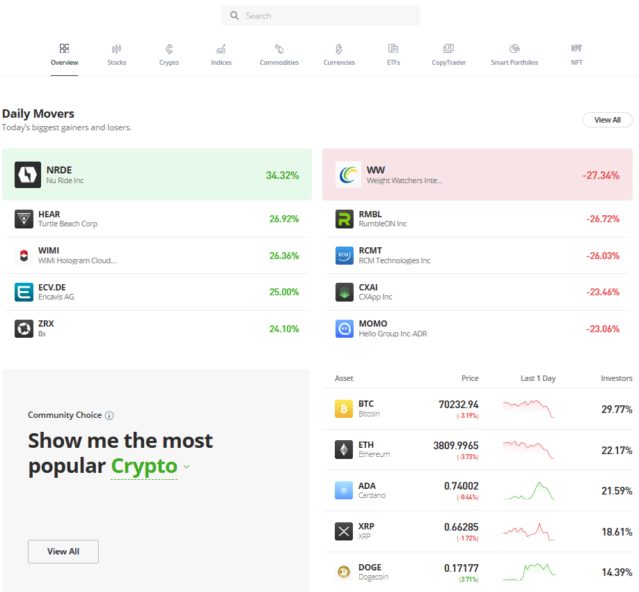 But for users who desire to develop a well-diversified portfolio for stocks, cryptos, EFTs, and commodities, eToro may be a better choice.