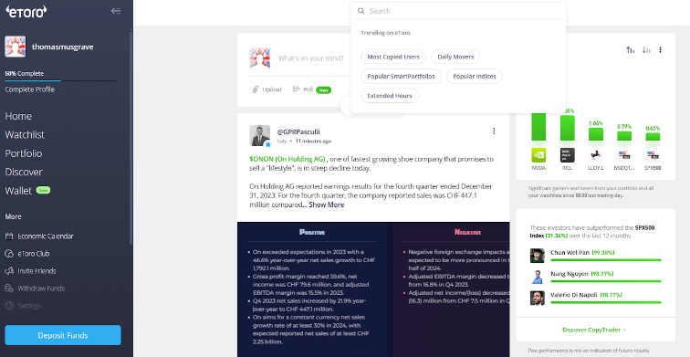 eToro’s AI assistant provides real-time insights, such as identifying top investors, popular stocks, and market movers, improving users’ decision-making process. Additionally, eToro offers free trading courses for beginners and advanced traders, making it an excellent platform for learning and execution.