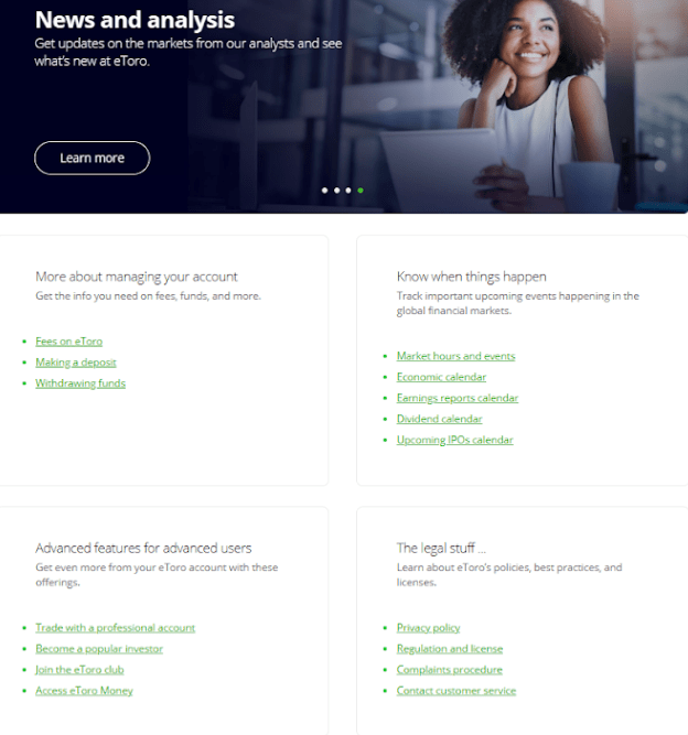 eToro offers a variety of helpful resources for beginners and those trying to find out more about eToro, including the eToro Academy, news articles, and different podcasts.