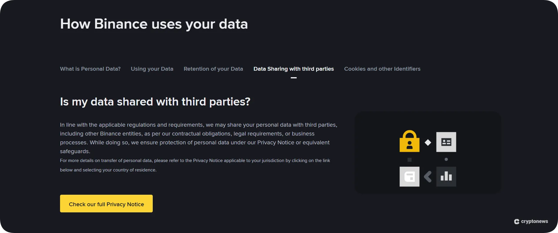 Binance supplies this information to third-party service providers, bank partners, and payment processors. Your information spreads across multiple companies and databases. The platform’s privacy policy allows data sharing for business operations and legal compliance.