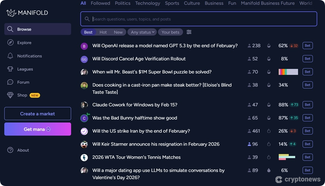 Manifold Markets is a play-money, social prediction market that allows anyone to create a market on any topic. Unlike traditional betting sites that restrict you to sports or politics, Manifold is an open ecosystem. If you want to bet on whether a specific GitHub issue will be closed by Friday, you can create that market in seconds.