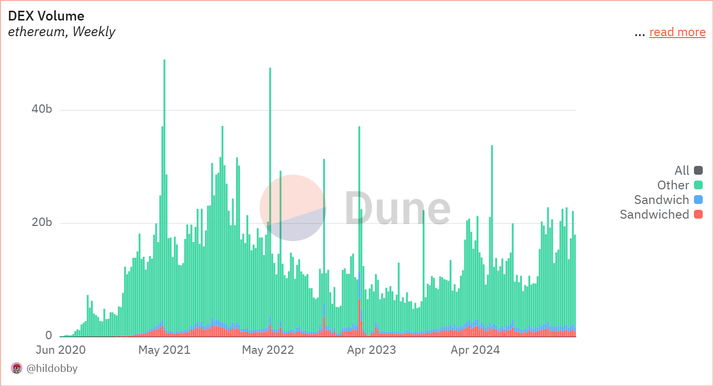 EigenPhi data shows that there were over 33,000 victims of sandwich attacks in March 2025, which were conducted by 101 entities. Sandwich attacks continue to represent a visible portion of trading volume on Ethereum-related DEXs. As of this writing, they account for nearly $1 billion in weekly trading volume.