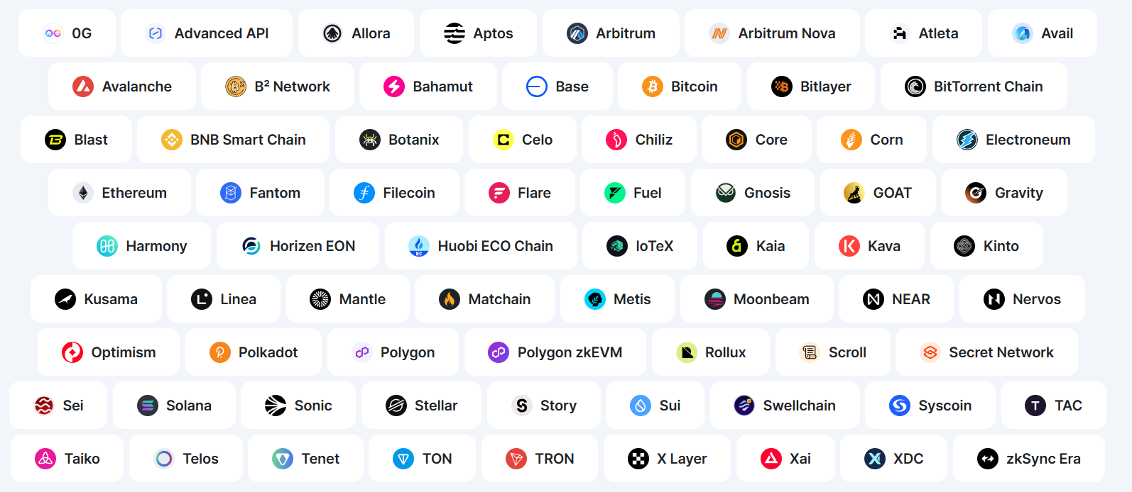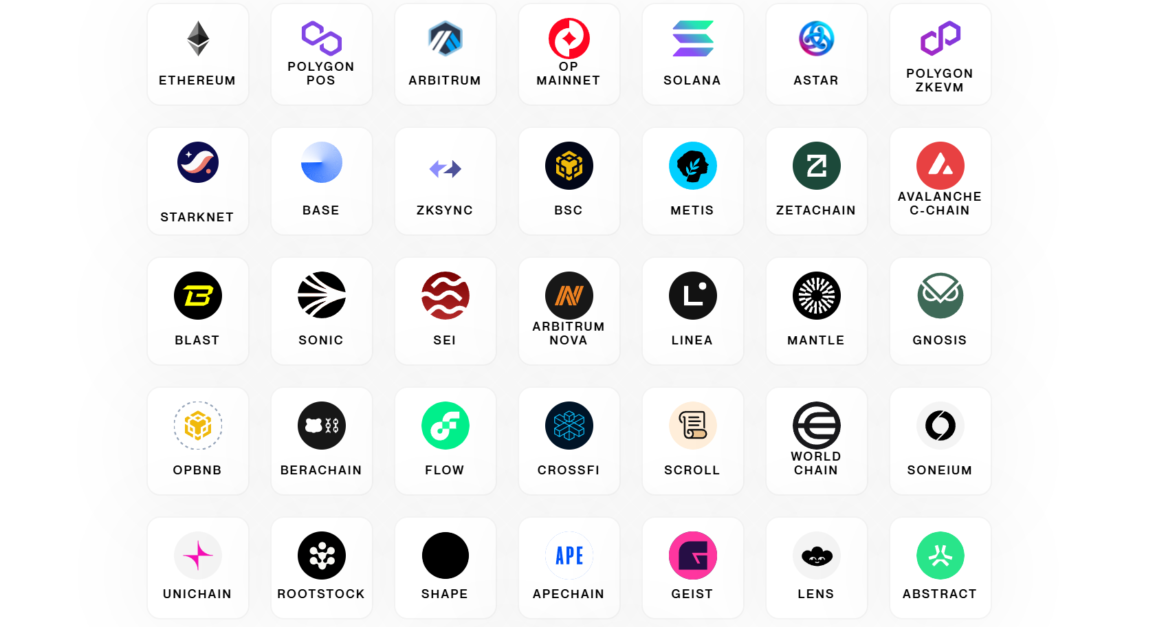 The platform supports over 35 Layer 1 and Layer 2 chains, including Ethereum, Solana, BNB Chain, Avalanche, Arbitrum, Base, OP Mainnet, Polygon, Sonic, Starknet, Blast, Linea, Flow, Soneium, Scroll, and Sei.
