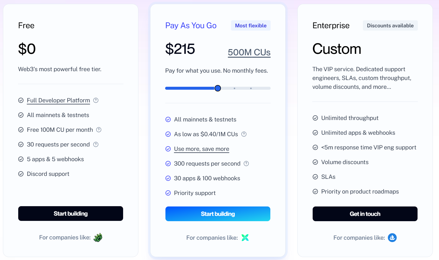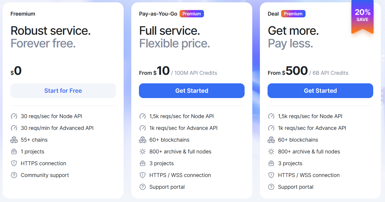 Larger projects and enterprises can choose between the Premium and Enterprise plans, which cost $10 per 100 million credits and $500 per 6 billion credits, respectively. Both premium plans support about 1,500 requests per second across more than 60 chains and offer a support portal.