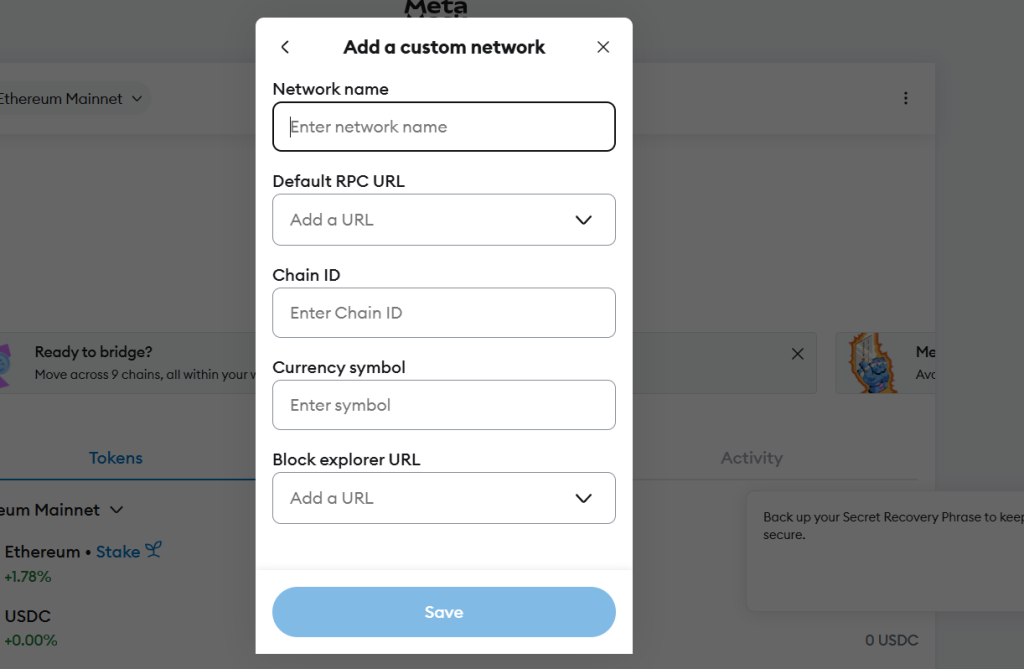 - Configure your wallet – In MetaMask, go to ‘Settings’ by clicking on the three dots at the top, then select ‘Security & Privacy’ and scroll to ‘Add Custom Network.’ Click the network icon and select ‘Add Custom Network.’ Here, you can insert the RPC URL, chain ID, and network name.
