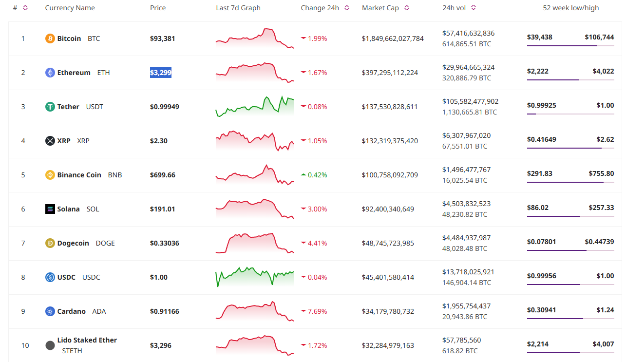 At the same time, Bitcoin (BTC) decreased by 2%, falling to $93,381.