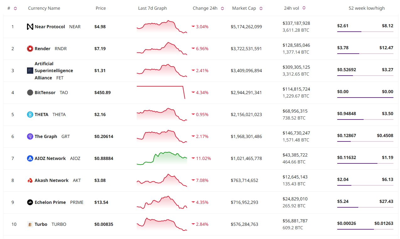 All coins in the top 10 AI coins category are down over the past day.