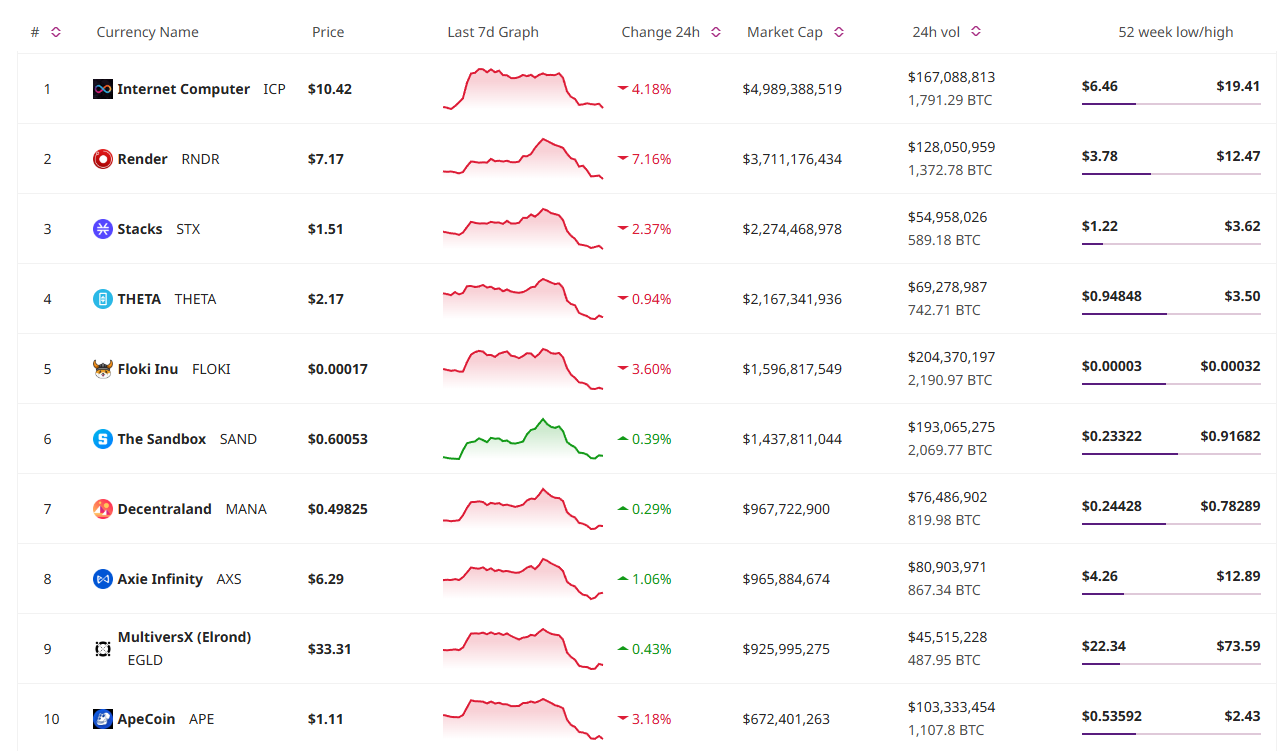 This drop is followed by the category’s number one coin, Internet Computer (ICP). It decreased by 4.2%, changing hands at $10.42.