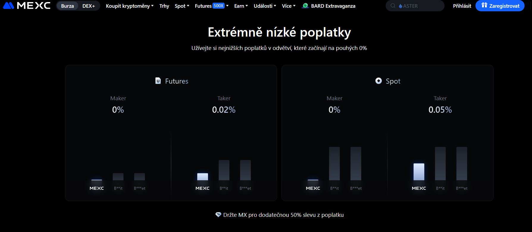 Velmi dobře vychází i OKX nebo MEXC, kde se díky vysoké likviditě a bonusovým programům dají poplatky ještě více snížit.