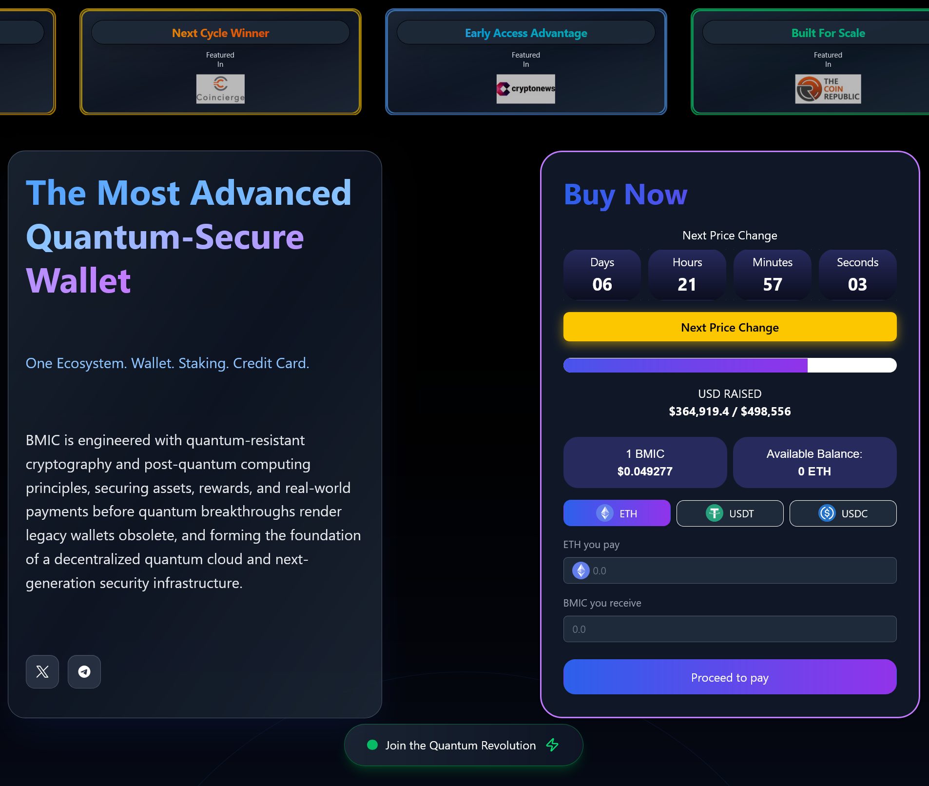 - BMIC – BMIC (Blockchain Micro-Ion Compute) představuje koncept „wallet-first“. Projekt stavěný na myšlence, že s rozvojem kvantových počítačů poroste riziko pro dnešní kryptografii (včetně scénáře „harvest-now, decrypt-later“) a zároveň je potřeba zpřístupnit kvantový výkon mimo několik velkých hráčů; proto popisuje čtyřvrstvou architekturu, kde „Quantum Security Layer“ spojuje kvantově-odolnou peněženku, staking a koncept kvantově-bezpečných plateb/karty.
