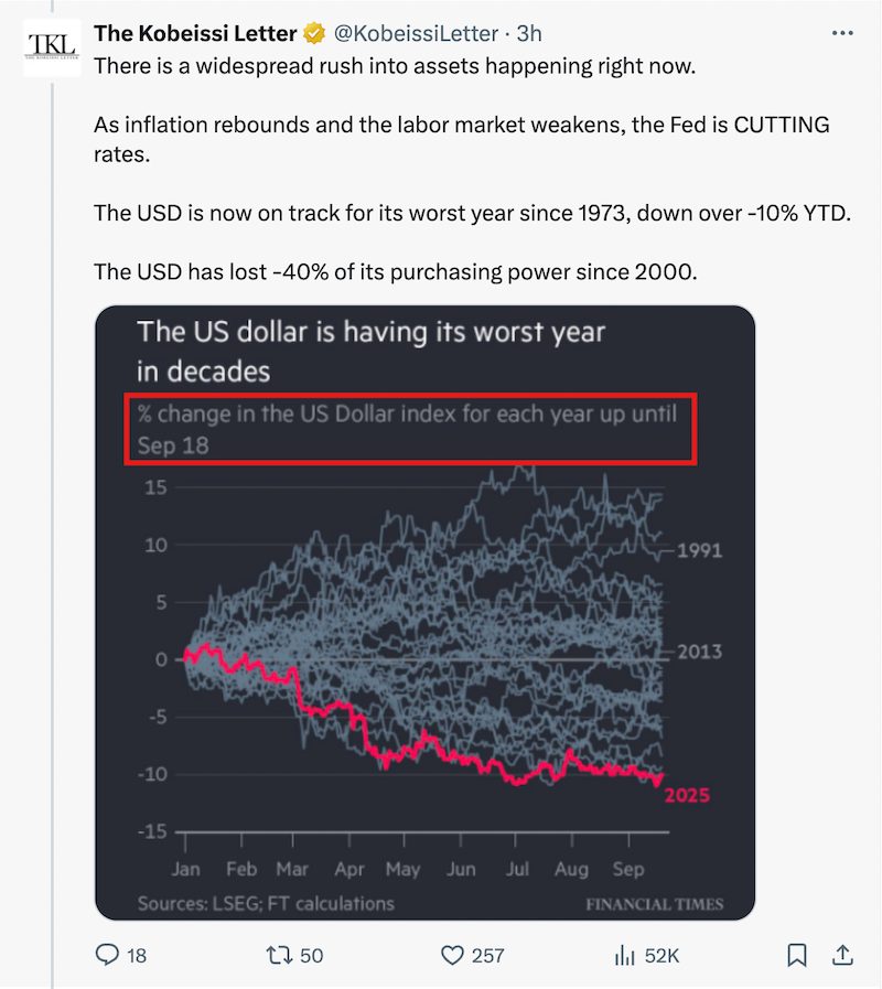 Společným jmenovatelem tohoto vývoje je oslabující americký dolar, který od začátku roku ztratil více než 10 % své hodnoty. Od roku 2000 přišel dolar o zhruba 40 % své kupní síly, což dále podporuje poptávku po aktivech s omezenou nabídkou. Investoři se tak přesouvají k aktivům, která považují za lepší uchovatele hodnoty v prostředí měnící se měnové politiky.