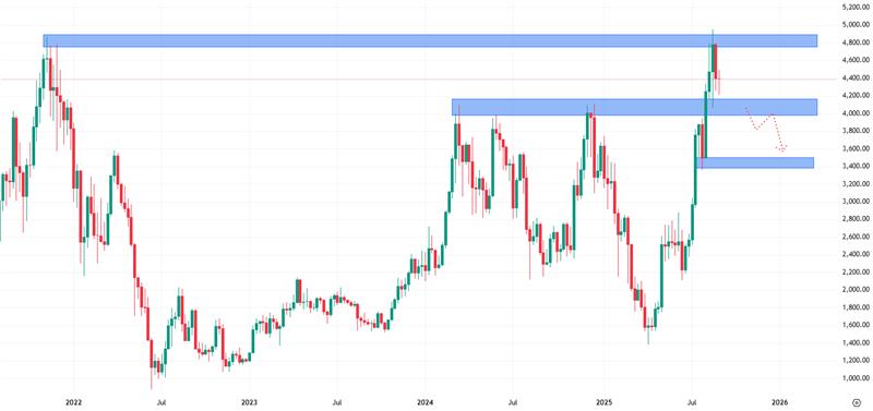 Současný vývoj má však i pozitivní stránku. Ethereum se totiž stále obchoduje nad hodnotou supportu z předchozích proražených maxim. Pokud by ale jeho cena klesla pod hodnotu 4 000 USD, mohlo by to spustit lavinu panických výprodejů, což by ještě více podpořilo down trend.