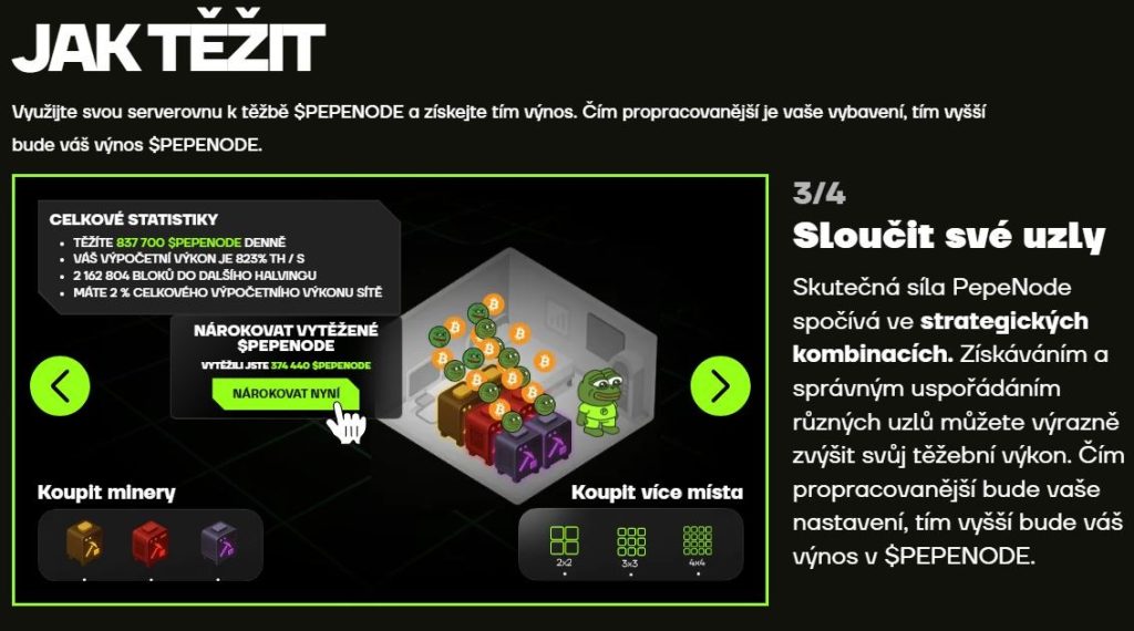 Celý systém běží na principu „mine-to-earn“, ale bez fyzické těžby. V praxi jen vytvoříte účet, pořídíte virtuální nody, sestavíte vlastní mining rigy a následně inkasujete pasivní odměny v PEPENODE a několika top meme coinech.