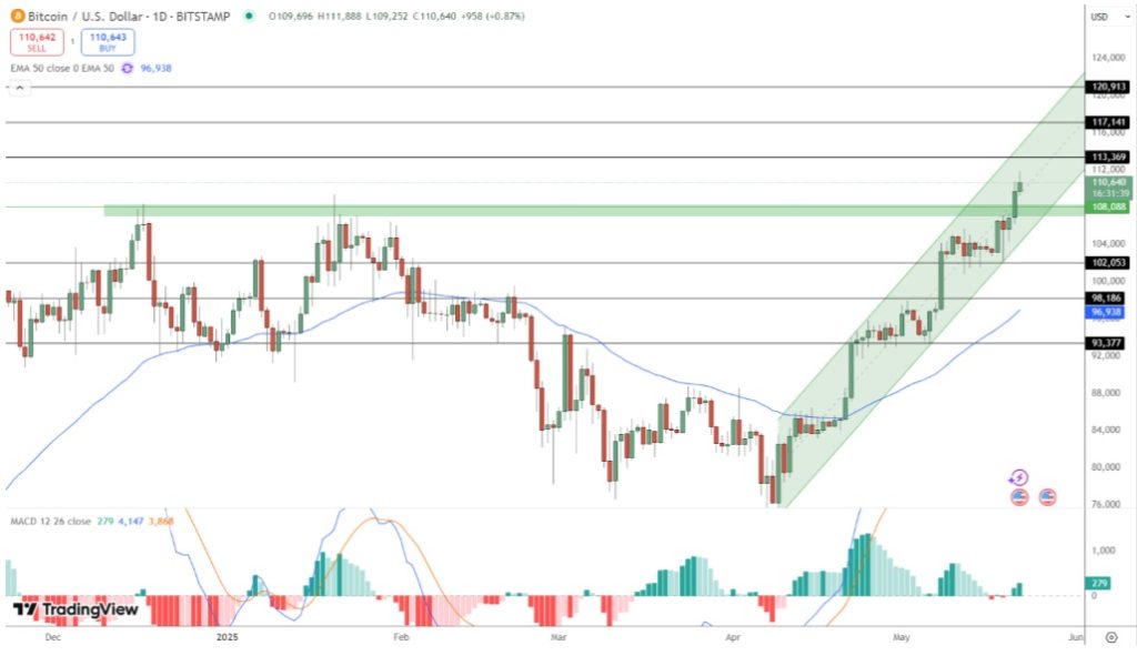 Co se týče technické analýzy, tak se bitcoin stále obchoduje ve velmi strmém trendovém kanále. Technický indikátor MACD vykresluje nákupní parabolu, což může značit potenciál pro pokračování tohoto růstu. Navíc nejbližší support na ceně 108 000 USD by koreloval se spodní hranou tohoto kanálu, což může být signál pro menší prodejní korekci v rámci tohoto růstového trendu.
