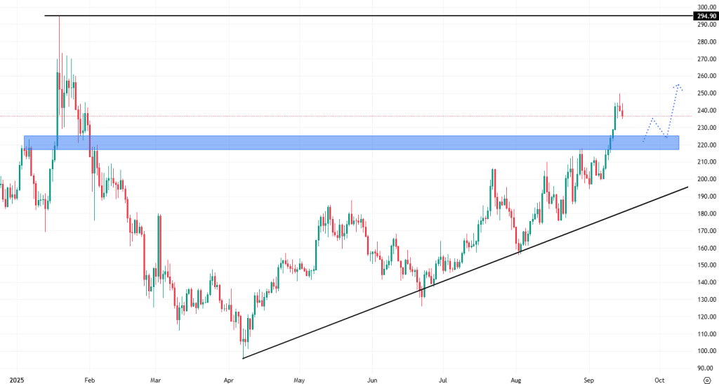 Za jejím cenovým růstem stojí velcí investoři, kteří se specializují na akumulaci různých kryptoměn. Podle dat z CoinGecko například americká společnost Sharps Technology přidala do svého portfolia 2 miliony SOL v hodnotě přes 472 milionů USD. Nákupní cena přitom činila okolo 238 USD, což odpovídá současnému swingovému maximu.