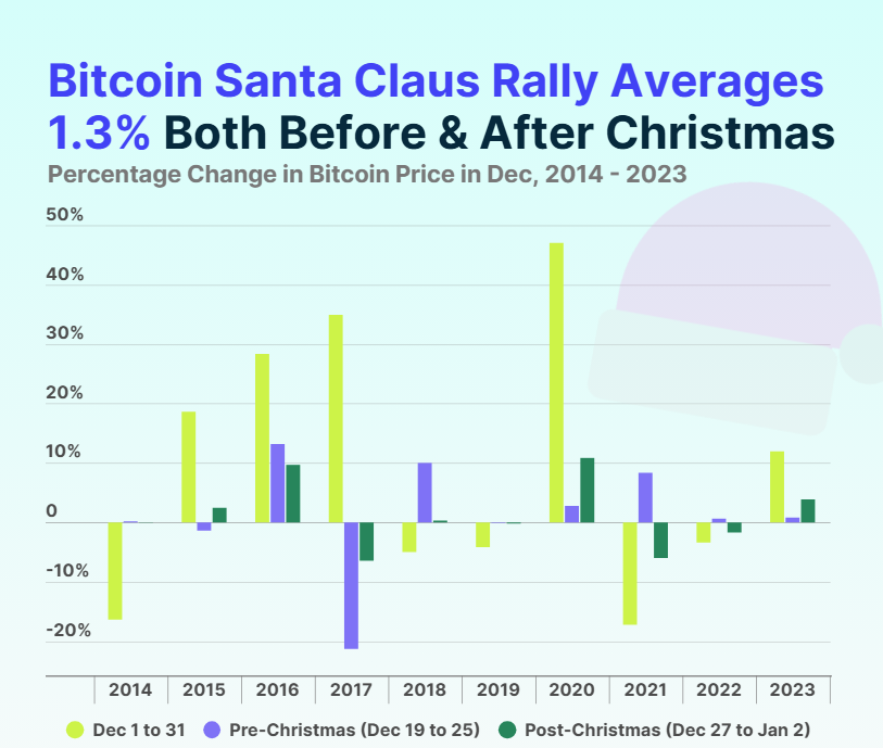 Bitcoin patří mezi aktiva, která během vánoční sezóny často přitahují pozornost díky své volatilitě. V posledních deseti letech zaznamenal růst sedmkrát z deseti v týdnu před Vánocemi a pětkrát z deseti po nich. Průměrný výnos se v obou obdobích pohyboval okolo 1,3 %, zatímco za celý prosinec dosahoval v průměru 9,5 %. To ukazuje, že krátkodobý „santovský efekt“ bývá slabší než celkový prosincový trend, ale přesto dokáže zaujmout aktivní obchodníky, kteří spoléhají na sezónní vzorce chování trhu.