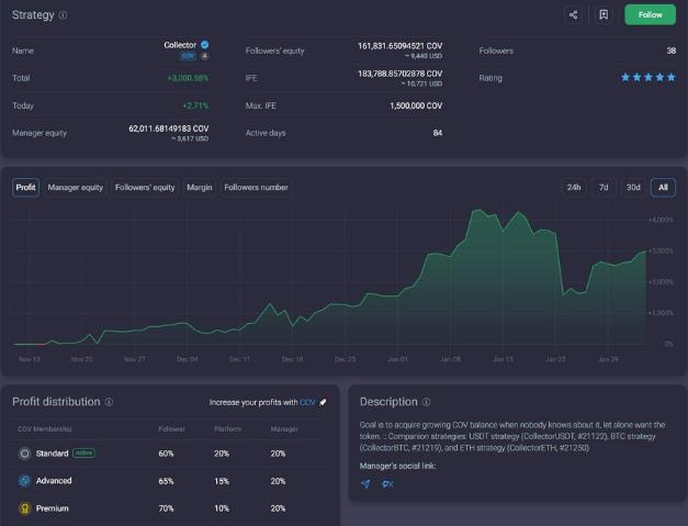Covesting ermöglicht es Benutzern, eine Strategie einzurichten und/oder einer bestehenden Strategie zu folgen. Die Strategie ist ein Pool der persönlichen Mittel eines Traders, die für die Allgemeinheit sichtbar sind. Trader, die eine Strategie erstellen (begrenzt auf eine pro Trader), erhalten einen Prozentsatz der Gewinne ihrer Follower, während Follower eine passive Einkommensquelle aufbauen können, indem sie automatisch jede Entscheidung eines erfahrenen Traders replizieren. Follower haben, im Gegensatz zu den Strategy-Makern, keine Strategy-Following-Limits.