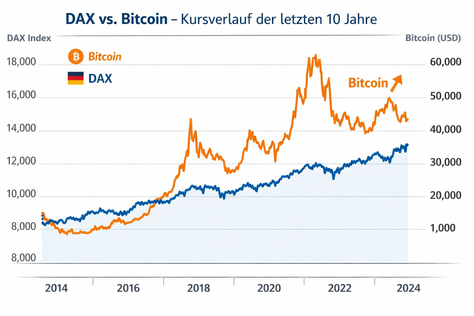 Wer jetzt denkt, er geht den Weg am klassischen Finanzmarkt und setzt sein Vermögen beispielsweise auf den DAX, sollte beachten, dass die möglichen Renditen hier deutlich geringer sind als bei Bitcoin.