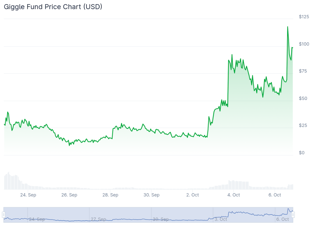 Das ist eine gute Sache, und der Markt hat das offensichtlich bemerkt. GIGGLE stieg am Montag auf $117 und verzeichnete damit einen Anstieg von 313% seit dem 24. September, bevor es auf $98,41 pro Token und eine Bewertung von $98 Millionen zum Zeitpunkt der Erstellung dieses Artikels zurückging.