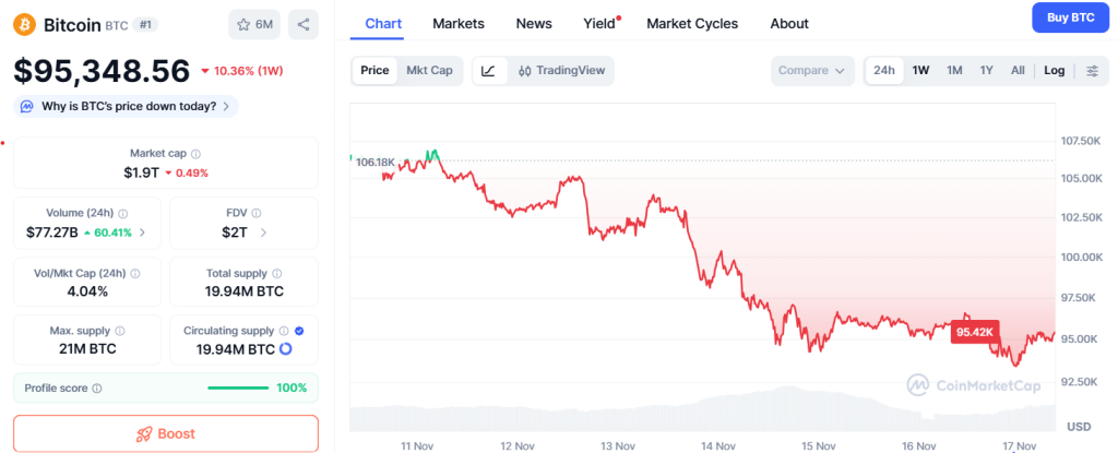 Zuletzt fiel Widerstand um Widerstand, eine nachhaltige Erholung ist weiterhin nicht in Sicht. Bitcoin rutscht immer weiter ab und durchbrach gestern sogar kurzzeitig die $93.000-Marke nach unten. Zwar hat sich der Kurs wieder erholt, doch mit einem Wert von $95.348 liegt BTC immer noch auf einem 6-Monats-Tief.