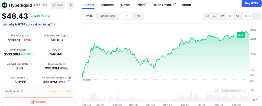 Dieser betraf den zuletzt höchst erfolgreichen Coin Hyperliquid. Dieser hatte seinen Wert in zwei Kursexplosionen seit Mai dieses Jahres auf deutlich über $50 getrieben. Damit ist jetzt allerdings vorläufig Schluss.