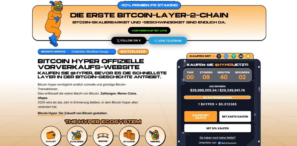 $HYPER ist ein Presale-Token, der auf einer Layer-2-Erweiterung des Bitcoin-Netzwerks basiert. Ziel dieser vielversprechenden Kryptowährung ist es, die Skalierbarkeit von Bitcoin zu erhöhen, ohne auf externe Chains auszuweichen. Nutzer können über $HYPER schnelle Transaktionen mit niedrigen Gebühren abwickeln, Staking-Erträge erzielen und auf integrierte Tools wie ein Wallet-System und Bridge-Funktionen zugreifen. Der technische Aufbau orientiert sich an bestehenden Rollup-Ansätzen, kombiniert diese jedoch mit einer stark reduzierten Blockzeit und einem innovativen Fee-Modell.