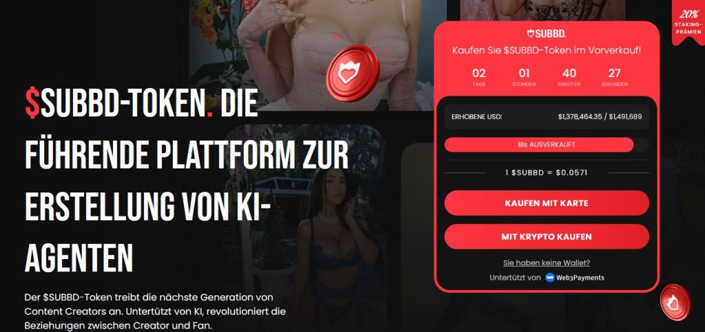 Der Presale von $SUBBD wird über mehrere Phasen abgewickelt und zeigt starkes Wachstum. Zahlreiche Top-Creator mit insgesamt über 250 Millionen Followern unterstützen das Projekt. Teilnehmer profitieren zugleich von konstanten Staking-Belohnungen (ca. 20 % APY) sowie Vorteilen wie Premium-Zugriff auf exklusive Livestreams, BTS-Inhalte und Mitgliederränge.
