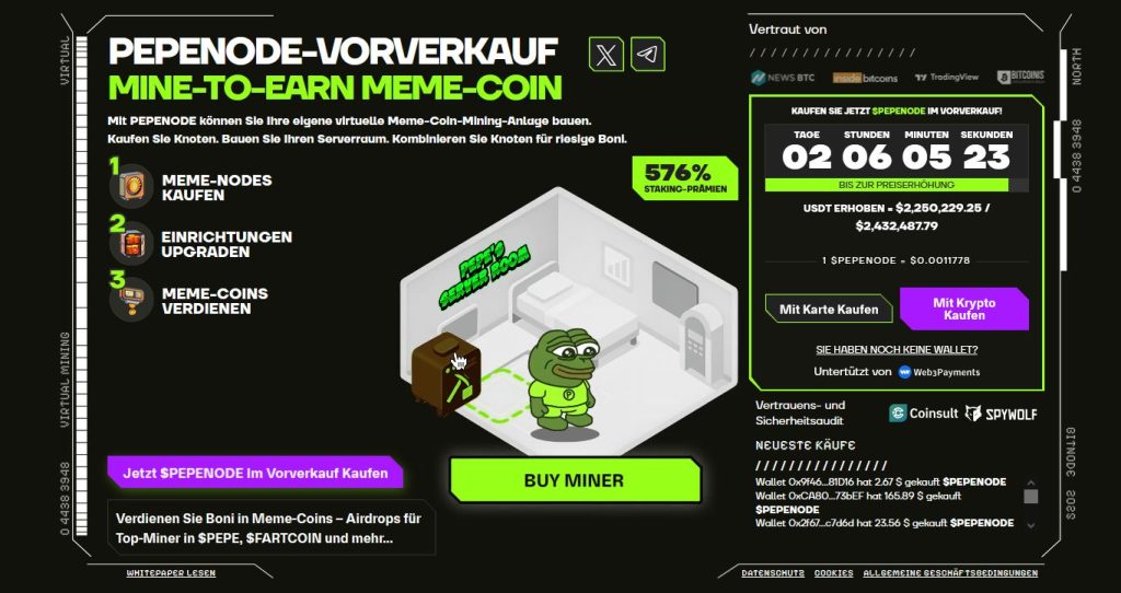 Einen vollkommen neuen Weg möchte PepeNode gehen, denn das junge Presale-Projekt bringt das klassische Krypto-Mining zurück auf die Ethereum-Blockchain – allerdings mit einem Twist. Denn um Energie zu sparen und den gesamten Ablauf stark zu vereinfachen, setzen die Entwickler auf Gamified Virtual Mining, bei dem Nutzer einfach über das Dashboard Nodes kaufen, upgraden und das Mining spielerisch nutzen können.