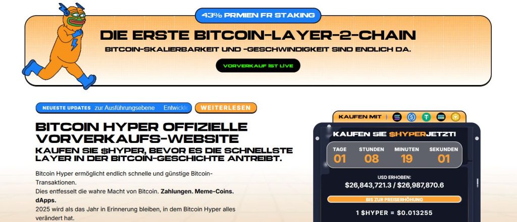 Während sich einige Wale von Bitcoin zurückziehen, scheinen einige von ihnen Interesse an einem neuen Projekt namens Bitcoin Hyper gefunden zu haben. Dieses möchte die Funktion von Bitcoin als Wertspeicher erweitern und BTC zur Umsetzung von DeFi und Smart Contracts nutzen.
