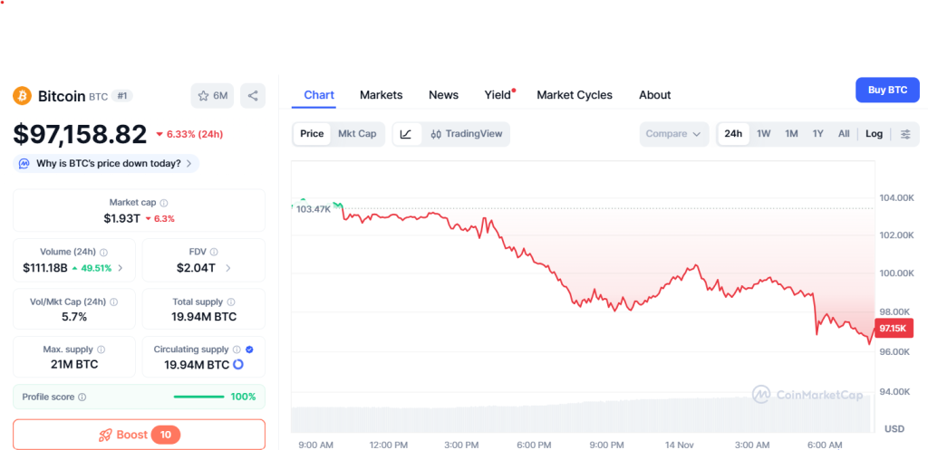 Alle Hoffnungen auf eine rasche Erholung haben sich jetzt offenbar endgültig zerschlagen. Gestern noch kratzte Bitcoin an der Marke von $104.000, doch danach ging es steil bergab. BTC ist mittlerweile nur noch $97.178 wert und hat damit einen 5-Monate-Tiefststand erreicht.