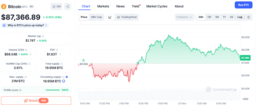 Der Versuch scheiterte jedoch, aktuell steht Bitcoin wieder bei $87.703 und kämpft damit, neuen Anlauf zu nehmen. Ob ein zweiter Versuch gelingen wird, steht noch in den Sternen. Jetzt ist jedenfalls die Zeit der Schnäppchenjäger gekommen. Sie sehen die Chance, günstig Bitcoin zu kaufen.