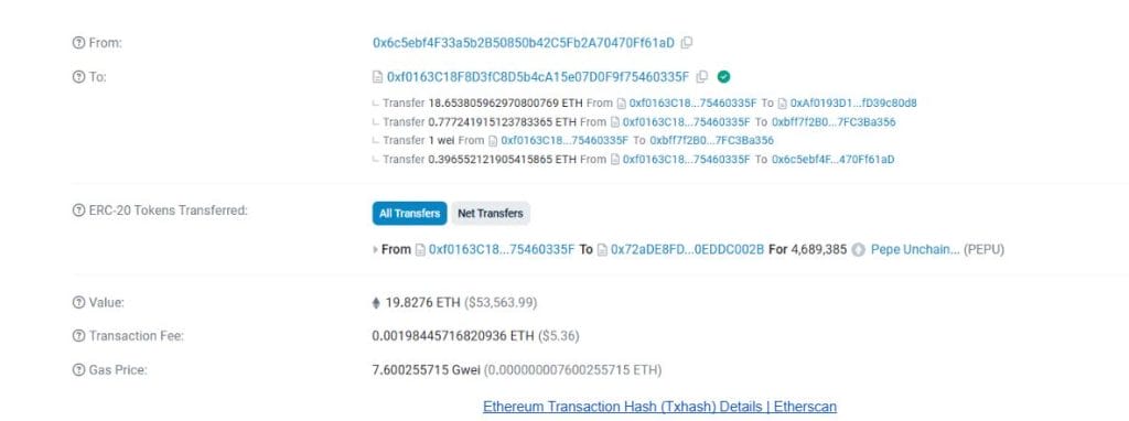 Am 21. Oktober sorgte ein Wal für Aufsehen, als er ETH im Wert von 53.563 $ für beeindruckende 4,6 Millionen $PEPU-Token verschlang, nachdem er zuvor bereits 5 Millionen $PEPU-Token für rund 50.000 $ gekauft hatte.
