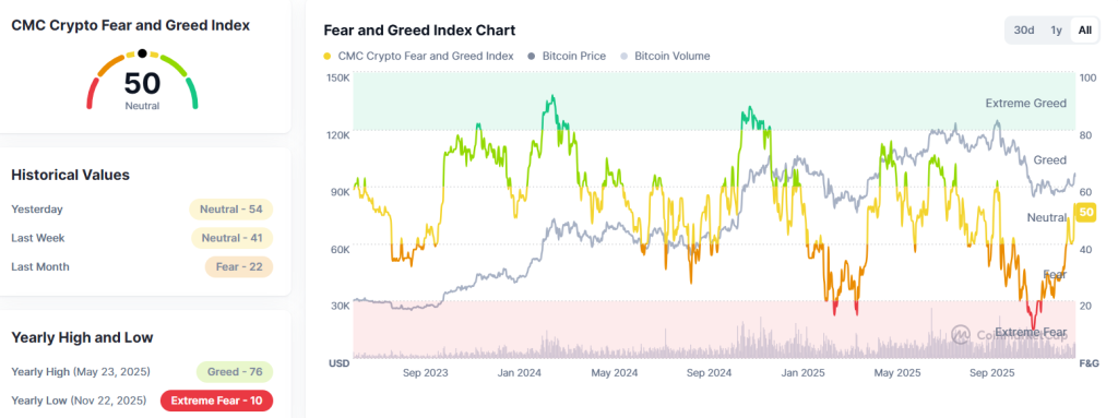 Diese Mittelzuflüsse ließen den Kurs von Bitcoin auf rund $98.000 anschwellen, bevor BTC wieder ein wenig nachgab. Aktuell liegt Bitcoin bei $95.511. Die gestiegene Stimmung am Markt spiegelt sich auch im Fear & Greed Index wider. Dieser befindet sich mittlerweile im neutralen Sektor und steht auf einem Wert von 50.
