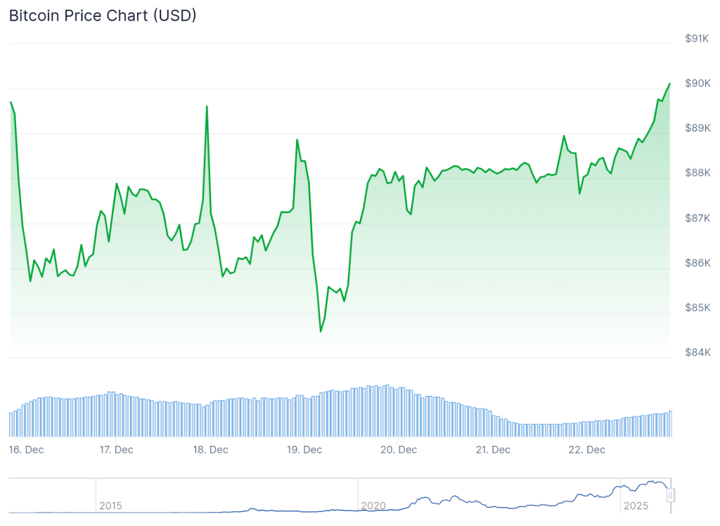 Bitcoin (BTC) bewegte sich am Montagmorgen wieder in Richtung 90.000 US-Dollar, was erneut Spekulationen aufkommen ließ, dass es noch vor Jahresende zu einer saisonalen Santa-Claus-Rallye kommen könnte.
