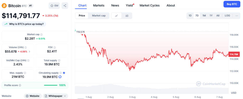Bitcoin reagierte in der letzten Woche ebenfalls auf die wirtschaftlichen Turbulenzen in den USA und gab neuerlich 3 Prozent nach. Die immer neuen Kursrekorde sind vorerst vorbei, Bitcoin notiert aktuell bei 114.800 Dollar. Noch vor sieben Tagen kratzte Bitcoin an der 119.000-Dollar-Marke, doch der Aufwärtstrend scheint vorerst gestoppt zu sein.