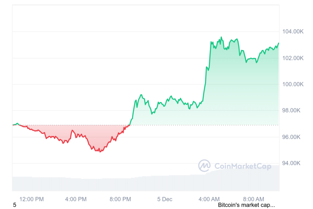 Ein Plus von mehr als 6.000 Dollar innerhalb kürzester Zeit: Bullen trieben Bitcoin über Nacht von 94.800 Dollar aus immer höher – und schlussendlich sogar über die magische 100.000-Dollar-Marke. Neues Allzeithoch nach dem Anstieg um 6,38 Prozent: 103.900 Dollar pro BTC!