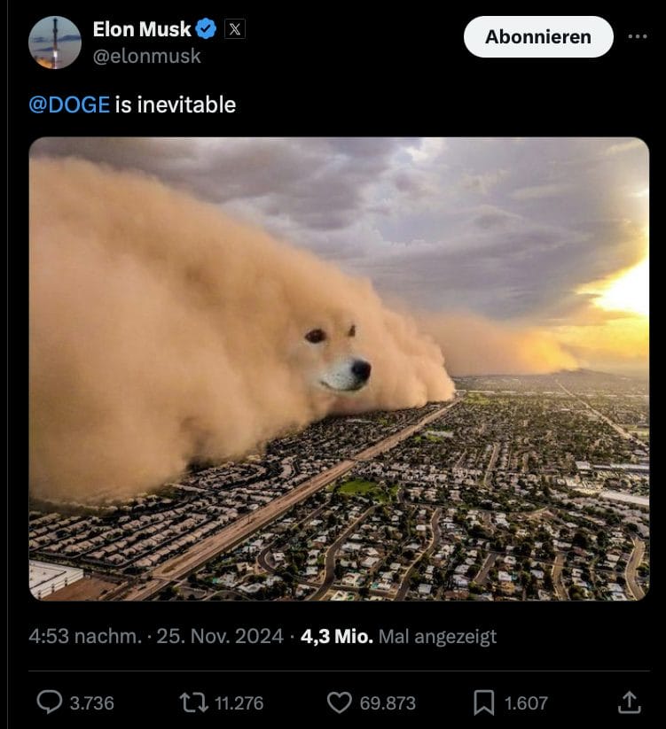 Hintergrund: Musk hat mehrfach auf die Verbindung zwischen DOGE und D.O.G.E. hingewiesen, sogar von Merchandise-Artikeln gesprochen. Das kurbelt das Interesse an Dogecoin an und wirkt potenziell auch bullish auf den Dogecoin Kurs.