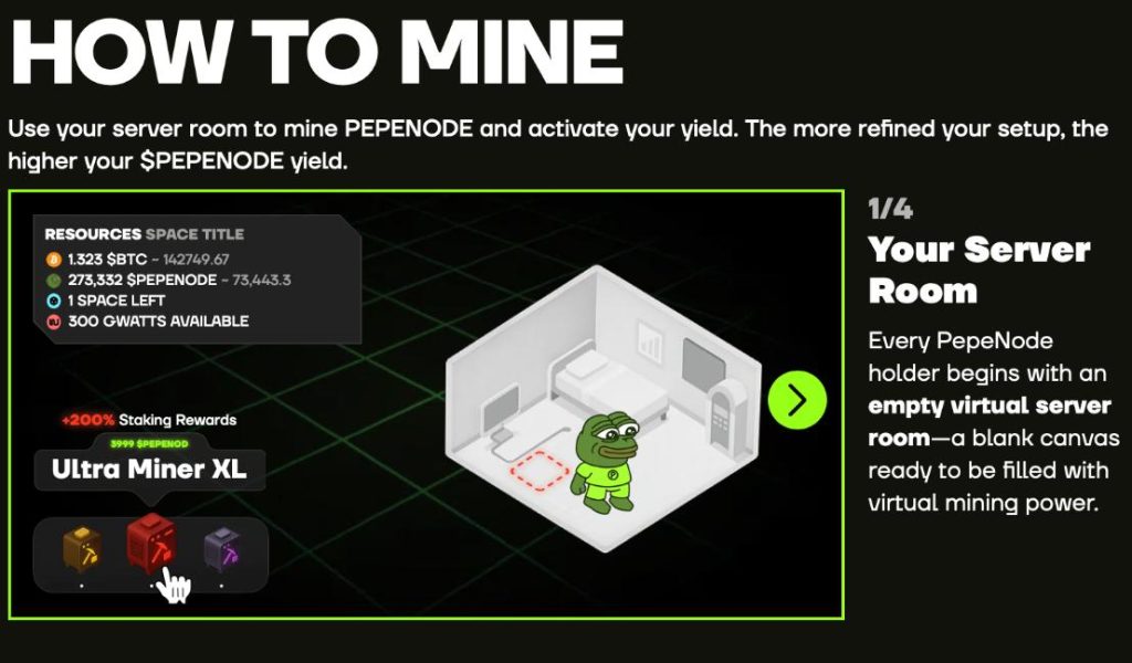 Einfach ausgedrückt, verwandelt PepeNode das Mining von Meme Coins in ein Strategiespiel. Die Spieler können virtuelle Setups aufbauen, Nodes kombinieren und die Belohnungen maximieren, je nachdem, wie gut ihre Rigs konfiguriert sind.