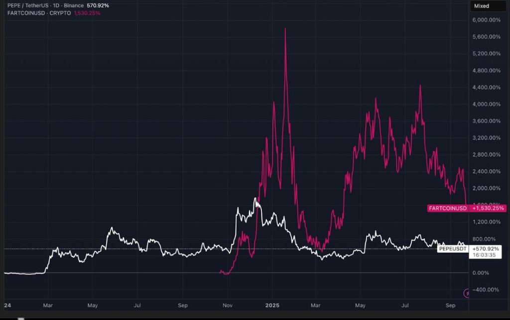 Das bedeutet aber nicht, dass Meme Coins keine großen Chancen bieten. Token wie PEPE und FARTCOIN haben das bereits bewiesen. Obwohl PEPE vor 10 Monaten seinen Höchststand erreichte, sitzen frühe Besitzer immer noch auf Gewinnen von mehr als 17.000% im Vergleich zu den Einstiegspreisen vor zwei Jahren.