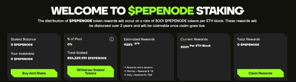 Und selbst in diesem frühen Vorverkaufsstadium funktionieren die PEPENODE-Token bereits. Die Inhaber können sie in das projekteigene Protokoll für eine dynamische Rendite von 923% APY gestakt haben und so Belohnungen aufbauen, lange bevor das volle Spiel live geht.