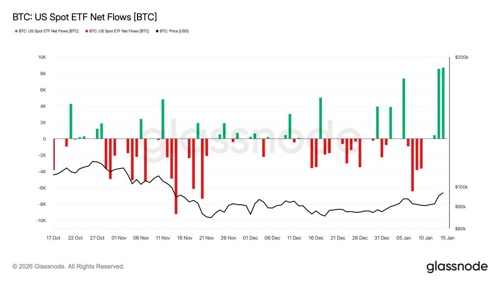 Die jüngsten Zuflüsse in Bitcoin-ETFs liefern ein weiteres starkes Argument für eine weiterhin bullische Bitcoin Prognose. Wie Bloomberg-ETF-Experte Eric Balchunas betont, flossen allein an einem Tag rund 843 Millionen US-Dollar in die Produkte, auf Wochensicht bereits etwa eine Milliarde und seit Jahresbeginn rund 1,5 Milliarden US-Dollar. Gleichzeitig notiert Bitcoin nahe 97.000 US-Dollar, nachdem der Kurs lange um 88.000 US-Dollar pendelte. Für Balchunas fühlt es sich so an, als hätten die Käufer die Verkäufer inzwischen weitgehend aufgesogen. Sollte Bitcoin die Marke von 100.000 US-Dollar erreichen, dürfte der Aufwärtsdruck weiter zunehmen.