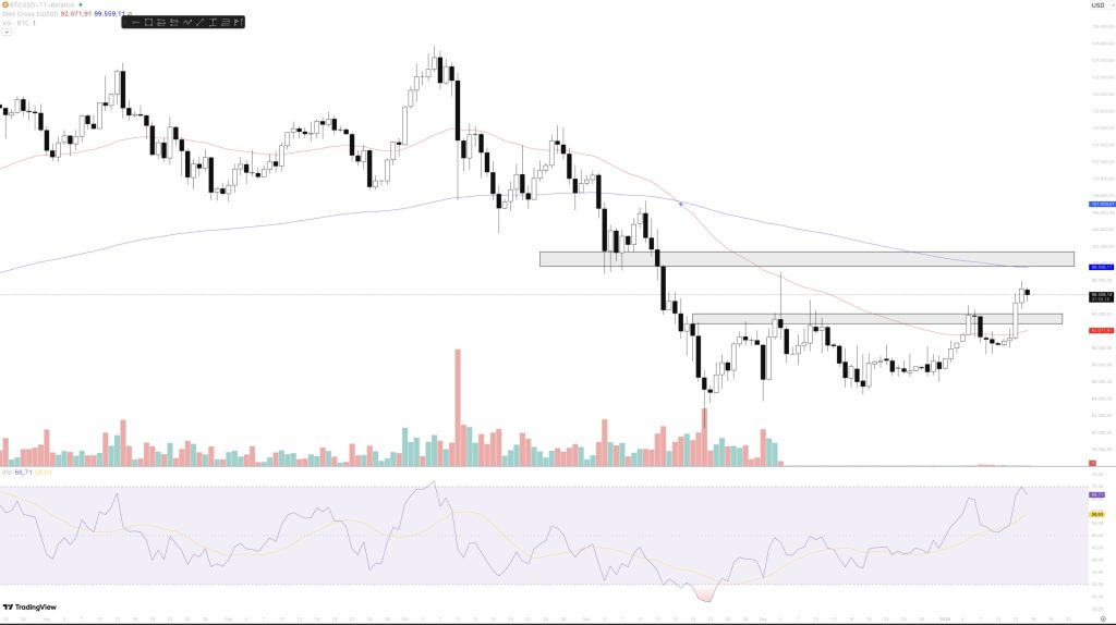 Auch aus charttechnischer Sicht lässt sich das aggressive Vorgehen des Traders gut nachvollziehen. Bitcoin ist zuletzt dynamisch über die Marke von 94.000 US-Dollar ausgebrochen und konnte dabei zugleich den wichtigen EMA 50 klar überwinden. Die Ausbruchskerze präsentierte sich ausgesprochen bullisch und signalisiert starkes Kaufinteresse. Aktuell folgt eine leichte Abkühlung, die nach einem so starken Impuls völlig normal ist.