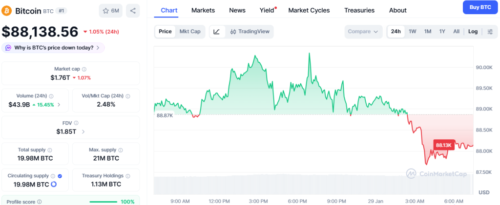 Angesichts der erwarteten Entscheidung reagierte Bitcoin nicht allzu heftig. Der Kurs rutschte kurzfristig auf $87.677 ab und erholte sich anschließend leicht. Aktuell steht BTC bei einem Wert von $88.193 und liegt damit 1% unter dem Vortag und 2% unter dem Kurs der Vorwoche. Die Investoren waren also mit dem Bitcoin kaufen weiter ab.