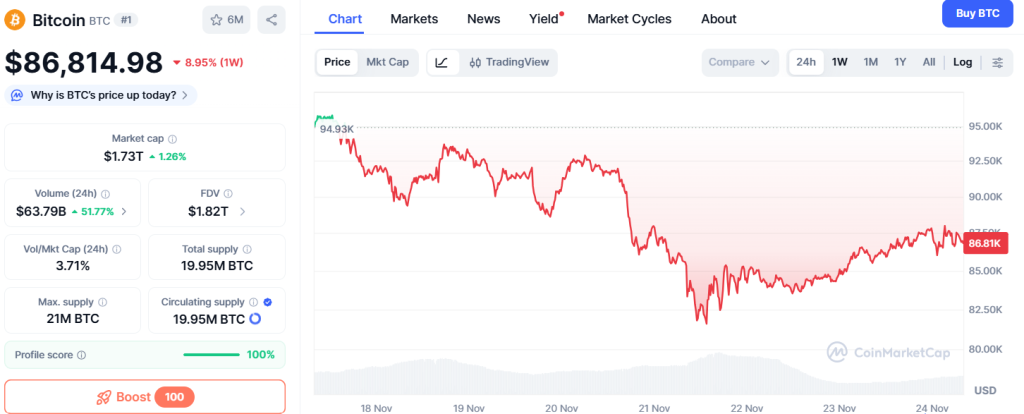 Bitcoin legte seit gestern wieder 1,43% zu und stieg auf $86.860. So reduzierten sich die Wochenverluste auf 9%, denn die Anleger entschieden sich wieder zum Bitcoin kaufen. Damit setzt sich der Aufwärtstrend seit Freitag fort. Jetzt hoffen die Investoren auf einen entscheidenden Impuls durch die Fed, an den in den vergangenen Wochen niemand mehr geglaubt hatte.