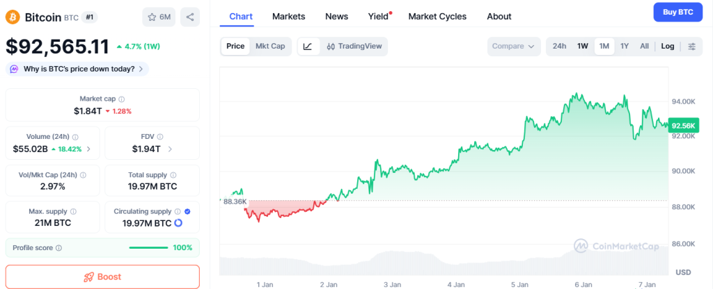 Bitcoin kletterte am Dienstag auf nahezu $94.500, bevor BTC wieder etwas nachgab. Seit gestern hat die Nummer 1 am Markt 1,31% nachgegeben und steht aktuell bei $92.884. Noch am 31.12.2025 war BTC lediglich rund $87.500 wert. Der Kurssprung seither ist beachtlich.