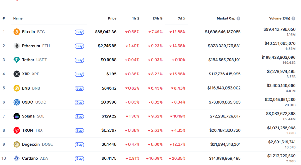 Der gesamte Markt präsentiert sich heute tiefrot. Kursverluste von weit über 10% sind die Regel geworden. Bitcoin hat seit gestern 10,76% verloren, im Wochenvergleich sind es 14,70%. Mit einem Wert von $83.437 liegt BTC mittlerweile deutlich unter der $90.000-Marke.