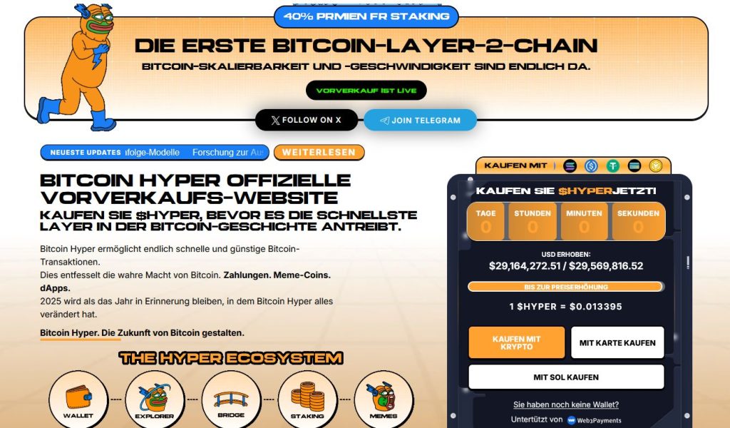 Im Zuge des Vorverkaufs konnten die Entwickler bereits mehr als $29,5 Millionen einsammeln. Doch die Zeit, um Bitcoin Hyper günstig zu kaufen, läuft ab, daher strömen jetzt noch viele Anleger zum Bitcoin Hyper Presale, um sich Anteile zu sichern.