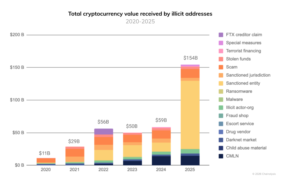 Laut dem Bericht von Chainalysis ist die Kryptokriminalität 2025 um 162% angestiegen. Unglaubliche $154 Milliarden sollen in und über illegale Wallets geflossen sein. Das wäre mehr als das Zweieinhalbfache des Jahres 2024.