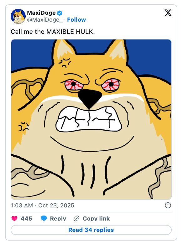 Wenn DOGE sich spielerisch über Bitcoin lustig gemacht hat, macht sich MAXI nicht über DOGE lustig. Es erinnert den Markt daran, worum es bei diesem Geist ging. Darauf zu warten, dass DOGE das Jahr 2021 wiederholt, ist so, als würden Sie darauf warten, dass Ihre Mitgliedschaft im Fitnessstudio Sie von selbst stärker macht. Der Nervenkitzel bestand schon immer darin, den nächsten Schritt zu erkennen, bevor alle anderen ihn erkennen.